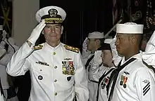 A Vice Admiral returns salute from enlisted sailors in dress uniform at a ceremony.