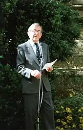 Peter Bayley speaking at University College, Oxford, in 1997