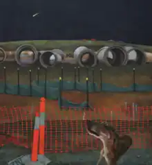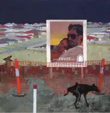 Bunting and billboards appear often in Serwan’s works. As devices they lend both compositional structure and meaning.[8] The billboard in Promised Land, with its glamorous figures, seemingly entranced by the prospect of living in the estate shown in the background, is a nod to the promise of consumerism to accommodate our deep desires. Partially obscuring the estate in the background, Serwan suggests that no one really knows what's going on in these nice new houses. The work, Serwan says, ‘taps into the deception of blissful outward appearances in a society obsessed with the bright and shiny...the peeing dog ‘throws water’ on the appearance of tranquil bliss.. outward appearances can be deceptive.’[9]