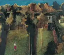 In the 1990s, Serwan’s works increasingly included figures. Figures first made an appearance in Serwan’s works form the 1980s, notably the artist’s father, Frank Serwan. In Manifestations of Time (1990), the artist’s father stands in a backyard next to a Hills Hoist clothesline, a Black Madonna appears at one window if the house behind him, a naked figure of woman in another. A flayed ox carcass, based on Rembrandt's Slaughtered Ox (1655) can be seen in the distance - a motif that appears prominently in another work depicting his father in a back yard setting Figure in a Yard (1989). Figure in a Landscape (1994) sees the artist’s father again standing next to a clothesline. This time he is in profile with one arm raised. The work Evening Interlude (1995) sees an elderly man holding a baby in a backyard. A cat scrambling over the fence is a counter to the solemn atmosphere.
