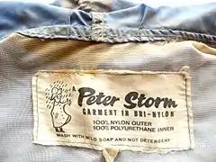 Vintage Peter Storm cagoule label showing garment fabric as polyurethane-coated nylon (the brown staining is from aged glue used to treat the sewing needle-holes that penetrate the PU coating in an effort to restore the fabric's water-repellent properties)