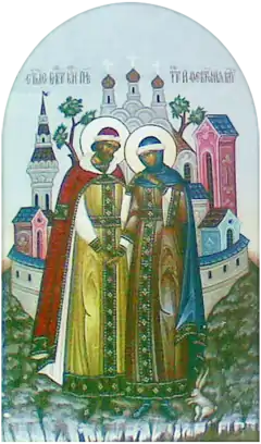 ![]() Mural Art of Saints Peter and Fevronia of Murom at the Spaso-Preobrazhensky Monastery, circa 2000 | |
