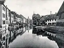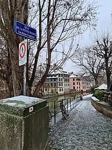 Downstream of the Ponts Couverts, the four channels flow through an area of largely half-timbered buildings which, together with the narrow lanes and footbridges that connect them, mostly date from the 16th and 17th centuries. The sloping roofs of many of the buildings include open lofts where hides were once dried. Three of the four channels flowing through the quarter run over weirs that once drove mills and other industries, whilst the northernmost channel is navigable. This passes through a lock and the Pont du Faisan swing bridge in the centre of the quarter, and is largely used by passenger trip boats.[1][6][7]