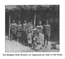 Kilekwa then went to Zanzibar, where the Universities' Mission to Central Africa took care of him.[1] He was baptized and trained as a teacher. He married a woman, Beatrice Muyororo, with a similar background: she had also been enslaved and then set free by the British Navy, and like Kilekwa she converted to Christianity and became a teacher. They taught together near Lake Malawi, where Kilekwa became a deacon and six years later a priest.[1] He was ordained at the end of June 1917, with three others: Leonard Kangati, Lawrence Cisui, and Gilbert Mpalila.[5]