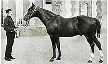 The stallion was described in Le Sport universel illustré of 23 March 1901 as a "handsome horse" with a golden chestnut coat, two barnacles on the hind legs and a broad head list, and measuring 1.61 m at the withers.[10] His morphology was reminiscent of a saddle horse, with long lines and short loins.[10] His hips were relatively round, and his chest and neck were said to be perfect. The head attachment was reminiscent of the Thoroughbred.[10] His tissues were particularly fine. Its legs were devoid of dewlap.[14]