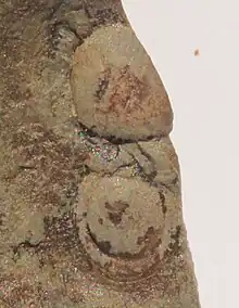 This agnostoid is strongly effaced. The cephalon lacks a border furrow. The glabella and small basal lobes are weakly defined. The rhachis is circular to ovate, clearly defined by deep axial furrows. An elongate axial node may be discerned. The pygidium has a narrow border defined by a furrow.[2]