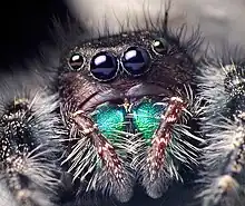 Phidippus is a genus in the family Salticidae (jumping spiders).[1] Some of the largest jumping spiders inhabit this genus, and many species are characterized by their brilliant, iridescent green chelicerae. Phidippus is distributed almost exclusively in North America, with the exception of two exported species (Phidippus audax and Phidippus regius).[2] As of January 2021, there were about 80 described species in the genus.[1] Species previously described in Phidippus which are found in India and Bangladesh do not belong in this genus.[2]