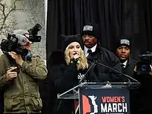 During her speech at the 2017 Women's March, Madonna drawn controversy after saying the word "fuck you" three times, and also for declaring: "Yes I have thought an awful lot about blowing up the White House, but I know that this won’t change anything. We cannot fall into despair" regarding Trump administration.[153] Madonna's comments sparked outrage among Trump staffers.[154] She later defended of backlash, by saying that she was speaking metaphorically, and shared two ways of looking at things: To be hopeful and feel anger and outrage.[155] The Sacramento Bee explored both positive and negative reactions on social media.[156] Her decision to perform at the Eurovision Song Contest 2019 drew backlash from Palestinian activists, scholars, and intellectuals groups ranging from PACBI to BDS.[157] Her message and performance received a polarized reception from viewers.[158] As one of the most criticized moves in her career, Middle East Monitor ranked her second, behind a Mariah Carey's concert in Saudi Arabi in their list of "10 artists hit by human rights criticism over concerts".[159] Madonna later expressed her decision and message in a lengthy post.[160]