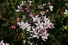 • Eriostemon buxifolia (Sm.) Paul G.Wilson subsp. buxifolia,[7] commonly known as box-leaf waxflower[8] has leaves are round to broadly elliptical, not folded lengthwise and have a heart-shaped base, and is mainly found in the Sydney area;[3]