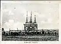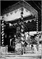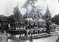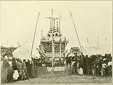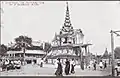 A staged play called eiyin (ဧယင်), which reflects the pain of the living mourning the departed and combines the Buddhist concept of rebirth and the monk's virtues and life, is performed from the moment the coffin leaves the monastery to the time of cremation.[1] These performances are held during the daytime, generally held in temporary gilt pavilions called san kyaung (စံကျောင်း), which are erected in the monastery grounds or the village squares.[1] Controversy has surrounded the expenses involved in financing such expensive ceremonies.[9]