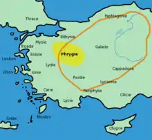 Phrygia was a kingdom in the classical antiquity, which existed between c. 1200–700 BC and situayed in the west central part of Anatolia, in today's Turkey. The Phrygians, who came to that region from Thrace crossing the Straits,[2] were engaged in agriculture and animal husbandry, in mining and weaving. They produced new musical instruments, developed a unique architecture and built temples and rock-cut tombs. [3] They were one of the dominant powers in Anatolia in the Early Iron Age (9–7th century BC).[2]