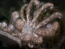 This is a very large species, growing to at least 140 mm. Phyllodesmium longicirrum contains photosynthetic zooxanthellae, which allow it to draw energy from sunlight, hence its common name, the solar-powered phyllodesmium.[3] This is actually a misleading name, as several other species of Phyllodesmium are also capable of photosynthesis, although this is developed to the greatest extreme in this species.[4][5]
