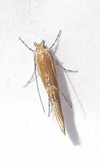 The wingspan is 8–9 mm. The forewings are reddish-ocbreous, posteriorly or sometimes almost wholly suffused with blackish-grey blotches; a slender white median streak from base to near middle, with a marked sinuation downwards; a slender oblique white streak from the middle of costa, and another from the middle of dorsum; sometimes a whitish tornal dot and anteapical strigula. Hind wings are grey or dark grey. The larva is pale yellowish; dorsal line green; head pale brownish.[1]