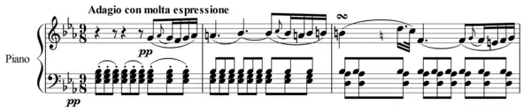 The second movement is in E♭ major and is also in sonata form. Its opening melody is often compared to the later music of Chopin.[2] The exposition starts in the tonic key and ends in the dominant key. The development plays around with the first theme of the exposition, slowly building intensity until both hands play constant sixteenth notes. The right hand plays a second voice above its 16th notes, and a little later, the left hand plays a bass line consisting of just B♭s. The left hand then stops and the right hand flows right into the recapitulation. The recapitulation stays in the tonic key for the rest of the movement.