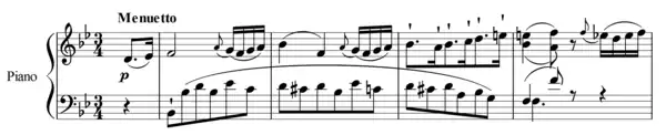 The third movement is in minuet and trio form, but the trio is instead a very contrasting "Minore". The first 30 measures of the Menuetto are in B♭ major, the Minore is in G minor (the relative minor of B flat major). The end of the Minore is marked Menuetto D.C. senza replica which means to play the Menuetto again, this time without taking the repeats. This is the shortest movement.[2]