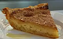 A 19th-century recipe for buttermilk pie is made by beating sugar with eggs, then adding butter and buttermilk. The custard is poured into a pastry-lined tin over a layer of thin apple slices.[9] To make a buttermilk lemon pie, eggs, flour and sugar are beaten together, then buttermilk and lemon are added. The filling can be made with egg yolks, and the whites used for a meringue topping.[10] Some versions add raisins, nutmeg, dates or vanilla flavoring. Buttermilk pie can be flavored with lemon or orange zest, the latter garnished with chopped walnuts, currants and cinnamon.[11]