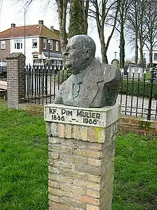 A bronze statue with a bust of plaster and painted gold of Pim Mulier stands in Witmarssum, Mulier's native village.[20] The sculpture was made by the artist Frank M. Zeilstra and placed on the occasion of the 100th anniversary of the Keatsferiening Pim Mulier in 1986.[20] In 2015, in celebration of Mulier's 150th birthday, numerous sports activities were organized from 10 March, when the kick-off was given at the Grote Markt in Haarlem, until November.[13]