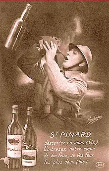 Pinard is a French term for wine (particularly red wine), popularised as the label for the ration of wine issued to French troops during the First World War. The term became wrapped up in the public conception of the poilu ("hairy one", the typical French foot soldier) and his beloved pinard, joined in a "cult of wine".[1][2]