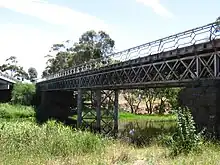 A wooden bridge was evidently in place in 1859, when the Victorian parliament called for the approaches to the bridge to be improved.[2] The bridge is on the same road as McMillans Bridge which was erected by the Victorian Central Road Board around the same time to a design of Charles Rowland, a student of prominent colonial engineer David Lennox.[3] Repairs, presumably to the timber spans, were made in the same year, suggesting the bridge had already been standing for some time.[4] Repairs were eventually carried out in 1863.[5]