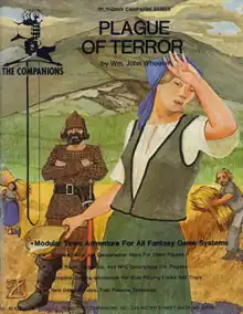 Plague of Terror, published in 1983, was the second part, a 56-page book with a center-bound color map written by Rice and Wheeler with additional material by Terry Ashbury, Chip Kestenbaum, and Lenard Lakofka, with illustrations by John Carlson, Mary Coman, David J. Hutchins, Kevin Pfusch, Patrick Rowland, and Wm. John Wheeler.[2]