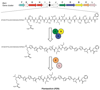 In bacteria, plantazolicin (PZN) is synthesized first as an unmodified peptide via translation at the ribosome. A series of enzymes then chemically alter the peptide to install its post-translational modifications, including several azole heterocycles and an N-terminal amine dimethylation.