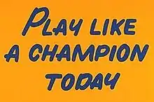 Play Like a Champion Today is a saying written on a sign created by Coach Bud Wilkinson of the University of Oklahoma Sooners in the 1940s to inspire the players as they entered Owen Field. It is located overhead in the tunnel leading out to the field in the south end zone at Oklahoma Memorial Stadium. The University of Notre Dame Fighting Irish football program later began using the saying as well.[1]