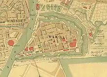 Attested in maps of Manila dating back to at least 1671,[2] Plaza Moriones was originally known as the Plaza de la Fuerza,[2] an empty lot which served as a military promenade for soldiers barracked inside Fort Santiago. It served in this role before the fort was damaged in the 1863 earthquake that devastated Manila,[3] after which it was converted into temporary military barracks. By 1875, the plaza was once again empty,[4] and as early as 1898, the plaza was already called the Plaza del General Moriones, after Domingo Moriones y Muralla, who served as Governor General from 1877 to 1881.[5]