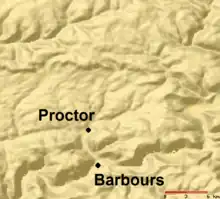 In 1868, Proctor was built as a company town in the midst of the timber required for the tannery (Barbours had initially been considered for the site). The second village on Plunketts Creek was originally named "Proctorville" for Thomas E. Proctor of Boston, who produced leather for the soles of shoes there. Proctor was brought to the area by William Stone of Standing Stone Township in Bradford County, who knew the area was "one vast tract of hemlock timber".[44] The Proctor tannery employed "several hundred" at wages between 50 cents and $1.75 a day, the employees living in one hundred twenty company houses, each renting for $2 a month.[6][35][44] Hemlock bark, used in the tanning process, was hauled to the tannery from up to 8 miles (13 km) away in both summer and winter, using wagons and sleds. The hides which were tanned to make leather came from the United States, and as far away as Mexico, Argentina, and China.[45] In 1892, Proctor had a barber shop, two blacksmiths, cigar stand, I.O.O.F hall, leather shop, news stand, a post office (established in 1885), a two-room school, two stores, and a wagon shop.[6][35] Finished sole leather was hauled by horse-drawn wagon south about 8 miles (13 km) to Little Bear Creek, where it was exchanged for "green" hides and other supplies brought north from Montoursville.[35]