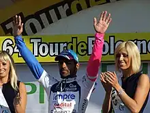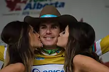 Podium girls, formally known as "tour hostesses" (French: hôtesses du Tour), are women who are best known for presenting prizes and kisses to the winners of the Tour de France and other major cycle races, including the Giro d'Italia and Vuelta a España. In the Tour de France, a team of four podium girls is employed by the race's main sponsor, the French bank LCL S.A.[1] They are responsible for entertaining clients of the sponsors before the morning departure of the race and in parties after the end of the race, but their most visible and prestigious role is in the award ceremony at the close of each day's racing. The job requires working long hours in all weather conditions but is well-paid and sought-after, with candidates selected on the basis of their looks, endurance, personalities, and linguistic abilities. Although they are forbidden to interact with the riders, other than kissing them in the award ceremonies, several podium girls have ended up marrying cyclists.