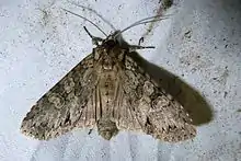 The wingspan is 41–52 mm. Forewing white tinged with brownish grey; stigmata as in Polia advena and Polia tincta; submarginal line preceded by black wedge-shaped marks, with one more conspicuous before the indentation of submedian fold; hindwing dull whitish, with, cellspot, veins, and a broad marginal border smoky fuscous; — ab. pallida Tutt represents a very white form taken in Scotland, with many of the dark transverse markings obsolete; — bimaculosa Esp. is the darker grey form with blacker markings; — robsoni Collins is a strong melanic form from Cheshire in the west of England only; there are also two aberrations from East Asia, — asiatica Stgr. (= lama Stgr.) being dull grey and smaller than typical, while askolda Oberth. from Askold Island [now ssp.] is a large brown form; — ab. calabrica nov. [Warren] is a very large form; the forewing with pale blue-grey ground colour, irrorated and suffused with dark grey in basal half (in one example all over the forewing), with all the lines and stigmata strongly expressed in black and pale grey, the submarginal line in particular being continuous, black and dentate, the hindwing is likewise much darker, with all the veins, the cellspot, and outer line wellmarked; a series of four males and ten females, in the Tring Museum, taken on the Sila Mts., near Botte Donata, Calabria, 800–1000 m, July 1907, by Dr. O. Neumann. This form reminds one somewhat of Polia goliath Oberth.[1]