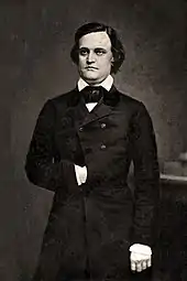 Breckinridge asked James Clay to protect his interests at the 1860 Democratic National Convention in Charleston, South Carolina.[152] Clay, Lazarus Powell, William Preston, Henry Cornelius Burnett, and James B. Beck desired to nominate Breckinridge for president, but in a compromise with Kentucky's Douglas backers, the delegation went to Charleston committed to former Treasury Secretary James Guthrie of Louisville.[150][152] Fifty Southern Democrats, upset at the convention's refusal to include slavery protection in the party's platform, walked out of the convention; the remaining delegates decided that nominations required a two-thirds majority of the original 303 delegates.[153][154] For 35 ballots, Douglas ran well ahead of Guthrie but short of the needed majority.[150] Arkansas's lone remaining delegate nominated Breckinridge, but Beck asked that the nomination be withdrawn because Breckinridge refused to compete with Guthrie.[153] Twenty-one more ballots were cast, but the convention remained deadlocked.[150] On May 3, the convention adjourned until June 18 in Baltimore, Maryland.[155]