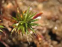 In P. piliferum, shorter leaves are located close together towards the tip of its red stems, giving the shoot a characteristic tapered shape.[7] The leaves have a distinct white, hair-like awn at the leaf tip, in contrast to the short red-brown awns of P. juniperinum. These leaves can be anywhere from 4 mm to 7 mm long,[13] although they may be shorter in dry areas.[6] The leaves of P. piliferum are costate and often stand erect, straight, and slightly in-curved when dry, and erect-spreading when moist.[3]