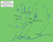 During this time he was rewarded further, first with a castle on the Tagus. The original document recording this grant, issued at Soria on 18 November 1153, has survived, and is one of possibly ten charters of Alfonso VII to have been authenticated with a seal.[36] At the same time, Ponce was rewarded with further governorships: Cea by 1152, Castrotierra by 1153, and Gatón de Campos by 1155.[37] His territorial lordships, however, were generally scattered, although they were all in the province of León and relatively near to the city itself, whose government he continued to hold throughout the period.[1] The lordship of Cea was shared with Ermengol VI of Urgell, according to a private charter of 23 June 1152. Another charter of 27 March 1150 shows Ermengol sharing it with Lope López, suggesting that Ponce was Lope's replacement.[38] In 1155, Ponce was with Alfonso for the capture of Andújar.[1] The last reference to Ponce holding Cea, site of a royal castle, dates from 28 June 1156.[39]