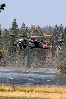 ![]() A California Army National Guard UH-60 Black Hawk dips water out of a local pond during the Ponderosa Fire | |