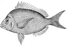 Porgy is the common name in Australia for any fish which belongs to the family Sparidae. They are also called bream. Porgies live in shallow temperate marine waters and are bottom-dwelling carnivores. Most species possess grinding, molar-like teeth.[1] They are often good eating fish, particularly the gilt-head bream and the dentex.[2]