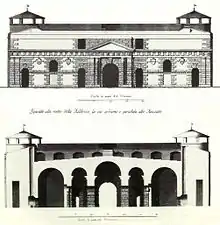 The current appearance of the monument, while not dissimilar to Sanmicheli's original one, has undergone other alterations as well, due to interventions that took place throughout the 19th century during the Austrian occupation, especially on the country-side façade. To this façade in 1852, in fact, two large lateral arches were added, with a rupture of the rhythm between the central portal and the two minor lateral ones;[1] a connecting corridor was also opened from the minor light on the right to the internal rooms and, on the front facing the city, the two rectangular openings placed on either side of the pediment were closed.[20] This intervention, which made a new addition to the original monument while remaining faithful to its design and construction technique, can be identified because of the "decidedly lower level" of the ashlar lining.[21]