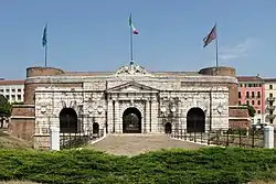 Construction of the gate began in 1532 with work on the elevation toward the countryside, under the jurisdiction of podestà Giovanni Dolfin and captain Leonardo Giustinian, whose coats of arms can still be seen on the facade,[7] as recorded in 1571 by the report of captain Lorenzo Donato.[11] An inscription, which has disappeared, located above the attic, mentioned by Scipione Maffei in 1732 and by Francesco Ronzani in 1831, was dated 1533.[7][12][13] In 1535, therefore, the elevation toward the countryside, as well as the interior of the building, were nearly completed. All that was missing was the replica of the Lion of Saint Mark to be set above the attic, which was difficult to place in such a position because it was "very large and difficult to move," according to what was written in a report dated March 16 of that year.[7][14]