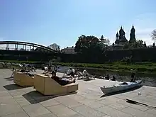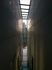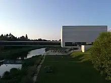 The authors of the project are architects: Arkadiusz Emerla and Maciej Wojda from Cracow studio Ad Artis Architects.[8] Porta Posnania is a complete urban complex which consists of the main building in the shape of a concrete minimalist cube, the 19th cathedral lock (where Śluza Gallery is currently located) and the pedestrian bridge (that connects these two buildings), the amphitheater over the river Cybina, the entrance to the main building in the form of a zigzak, a park with plane trees and concrete benches and a parking for visitors. Inside, the main building is divided into two parts by a long corridor with a glass ceiling. The upper floors of the exhibition are connected by glass bridges. Passing from hall to hall at the exhibition on these bridges, visitors can see through the window the cathedral, which is located on Cathedral Island opposite the Porta Posnania.[9][10][1]