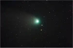 A comet is a small solar system body bigger than a meteoroid, when close enough to the Sun, exhibits a visible coma (fuzzy "atmosphere"), and sometimes a tail, both because of the effects of solar radiation upon the comet's nucleus. Comet nuclei are themselves loose collections of ice, dust and small rocky particles, ranging from a few hundred metres to tens of kilometres across.