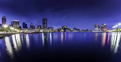 Panorama at night of the Inner Harbor