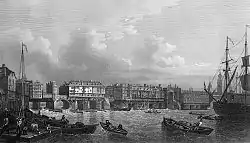 Although there has been a bridge on the site since the time of the Romans, the most famous is probably 'Old' London Bridge, which was lined with shops, inns and houses. It opened in 1209 and stood for over 600 years. Only two fragments of this renowned bridge survive—two pedestrian alcoves at the east end of Victoria Park, in east London, where they were placed in 1860, although the old bridge was demolished in 1831 after remaining in service while a new crossing was constructed.