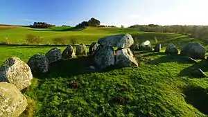 Poskær Stenhus is the largest round barrow in Denmark, dating back to 3.300 B.C. It is located by the village Knebel on the hilly southern part of the peninsula, Djursland, at the entrance to the Baltic Sea between Denmark and Sweden in northern Europe.[1] The central burial chamber is equipped with a capstone weighing 11 tonnes (12 tons), surrounded by 23 slabs taller than a man, forming a circle.[1]