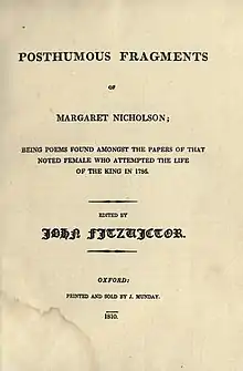 Posthumous Fragments of Margaret Nicholson was a collection of poetry published in November, 1810 by Percy Bysshe Shelley and his friend Thomas Jefferson Hogg while they were students at Oxford University.[1] The pamphlet was subtitled: "Being Poems found amongst the Papers of that Noted Female who attempted the Life of the King in 1786. Edited by John Fitzvictor." The pamphlet was published by John Munday and Henry Slatter in Oxford and consisted of fictional fragments that were in the nature of a hoax and prank or burlesque.[2]