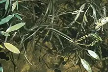 Ribbonleaf pondweed generally grows in shallow, standing to slow-flowing standing and running waters at up to 1900 m altitude.[3] It tolerates acid waters as low as pH 5 and has a preference for oligotrophic, soft water conditions.[4][10][11] Liming experiments suggest that it is sensitive to severe acidification.[12] It is a poor disperser relative to many other aquatic plants occurring in Connecticut lakes.[10]