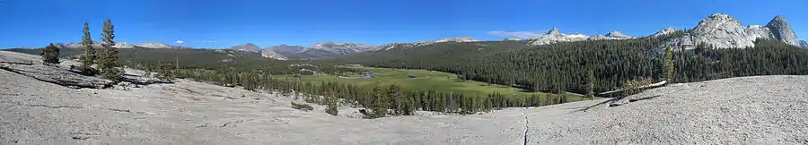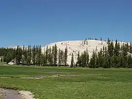Pothole Dome is a granite dome on the west side of Tuolumne Meadows, in Yosemite National Park located at Tioga Road mile marker 18.[1] Near Pothole Dome is Marmot Dome.[3] The summit of the dome is easily accessible by foot from a parking area on the Tioga Road at mile marker 18. The view from the summit includes most of Tuolumne Meadows and in the distance, Cathedral Peak.[4] The dome gives evidence of many of the geologic processes at work in Yosemite during and after the last ice age. In particular, the stranded, rounded boulders from a glacier that has long since retreated, and the water-eroded "potholes" provide evidence of two ways that water can interact with granite.[5]