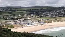 Praa Sands (Cornish: Poll an Wragh = Salt Pool of the Wrasse),[1][2] (formerly Prah Sands) commonly pronounced pray or prah, is a white-sand beach and coastal village in Cornwall, England. It is in the parish of Breage and lies off the A394 road between Helston and Penzance.[3] Formerly serving the local mining industry, it is now mostly a tourist-orientated area. The beach is popular with surfers and walkers. Towards the south eastern end of the beach is a WW2 Type 24 pillbox. Originally this was constructed on top of the cliffs but it has been subjected to coastal erosion and has settled down onto the beach.