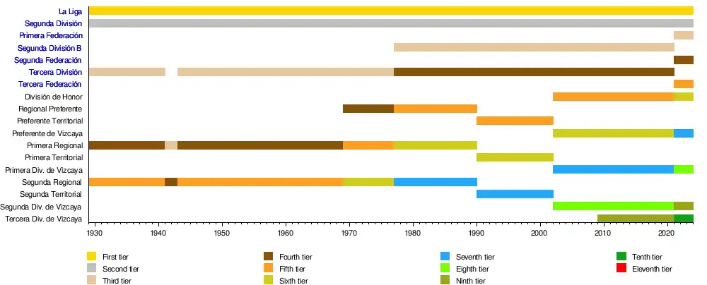 The Preferente de Vizcaya is at the seventh level of Spanish football. All of the clubs are based in the province of Biscay. The league consists of 18 teams. At the end of the season, the top three clubs are promoted to División de Honor. Three clubs are relegated to the Primera División de Bizkaia.