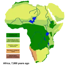 The prehistory of Southern Africa spans from the earliest human presence in the region until the emergence of the Iron Age in Southern Africa. In 1,000,000 BP, hominins controlled fire at Wonderwerk Cave, South Africa.[1] Ancestors of the Khoisan may have expanded from East Africa or Central Africa into Southern Africa before 150,000 BP, possibly as early as before 260,000 BP.[2][3] Prehistoric West Africans may have diverged into distinct ancestral groups of modern West Africans and Bantu-speaking peoples in Cameroon, and, subsequently, around 5000 BP, the Bantu-speaking peoples migrated into other parts of Sub-Saharan Africa (e.g., Central African Republic, African Great Lakes, South Africa).[4]