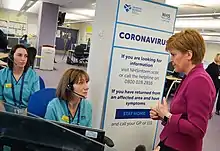 The worldwide pandemic of COVID-19 occurred during Sturgeon's second term as first minister. To contain and limit the number of affected people in Scotland, Sturgeon and the Scottish Government highlighted a number of measures advised by NHS Scotland, initially maintaining effective hand washing.[83] The first confirmed case of the virus in Scotland was announced on 1 March 2020, when a resident in Tayside had tested positive. In the following days, Sturgeon issued further advice and guidance as the number of positive cases began to increase, but had said that closures of public places such as schools and shops "would be reviewed".[83]