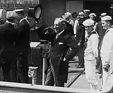 After the election, Wilson quickly chose William Jennings Bryan as Secretary of State, and Bryan offered advice on the remaining members of Wilson's cabinet.[11] William Gibbs McAdoo, a prominent Wilson supporter who married Wilson's daughter in 1914, became Secretary of the Treasury, while James Clark McReynolds, who had successfully prosecuted prominent antitrust cases, was chosen as Attorney General. On the advice of Underwood, Wilson appointed Texas Congressman Albert S. Burleson as Postmaster General.[12] Bryan resigned in 1915 due to his opposition to Wilson hard line's towards Germany in the aftermath of the sinking of the RMS Lusitania.[13] Bryan was replaced by Robert Lansing, and Wilson took more direct control of his administration's foreign policy after Bryan's departure.[14] Newton D. Baker, a progressive Democrat, became Secretary of War in 1916, and Baker led the War Department during World War I.[15] Wilson's cabinet experienced turnover after the conclusion of World War I, with Carter Glass replacing McAdoo as Secretary of the Treasury and A. Mitchell Palmer becoming Attorney General.[16]